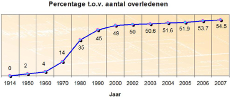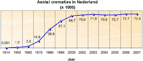 Steeds meer Nederlanders kiezen voor crematie. Koos in 1950 nog slechts 2.01% van de Nederlanders voor deze vorm van lijkbezorging, inmiddels is dit percentage opgelopen tot 54,48%. Vorig jaar lieten 72.434 Nederlanders zich cremeren. In dat jaar bedroeg het totaal aantal uitvaarten 132.948 (gebaseerd op de voorlopige sterftecijfers van het Centraal Bureau voor de Statistiek).
