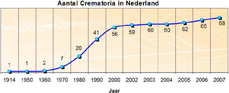 Het aantal crematoria steeg vorig jaar opnieuw van 65 (2006) naar 68 (2007). De groei van het aantal crematoria lijkt niet te stuiten. Inmiddels zijn er plannen voor crematoria in Tiel, Zutphen, Sambeek (regio Boxmeer) en Hoogeveen. Bijna wekelijks komen er plannen voor nieuwe crematoria aan het licht.