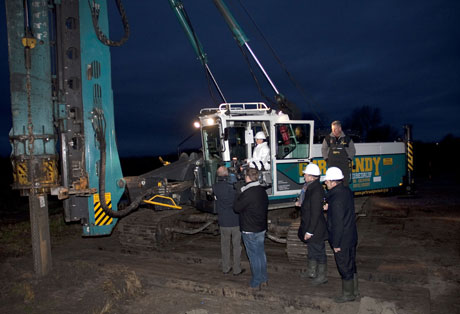 Mevrouw S. de Boer-Van der Goot heit de eerste paal terwijl rechts op de voorgrond Alex en Bas de Boer toekijken. (Foto Henk Doevendans)