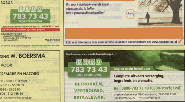 Het meldnummer voor overlijdensmeldingen 0800-STERFGEVAL heeft haar landelijke advertentieprogramma in de Gouden Gids aanzienlijk uitgebreid. Het toenemende aantal overlijdensmeldingen en de toetreding van een aantal nieuwe klanten maakt deze extra investering mogelijk", aldus initiatiefnemer Peter van Schaik. Bekijk hier de landelijke campagne.