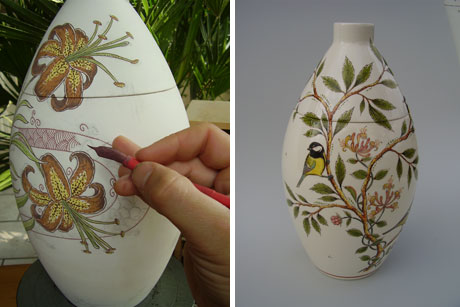 De speciale verven waar hij mee werkt worden geproduceerd in eigen atelier volgens eeuwenoud traditioneel recept. De afbeeldingen op de urnen bestaan uit diverse motieven, ook speciale decoraties op verzoek van familie. Veel ‘natuurlijke’ onderwerpen, maar ook abstracte decoraties. Verder is er ook een urn met het motief ‘Kaartspel’.