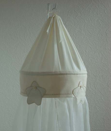 De Sterrenklamboe maakt deel uit van een vierdelige set. Het royale kinderbaarkleed is 1.50 x 1.50 m en is gemaakt van een naturelkleurige wafelstof met een sterapplicatie in de hoek, geborduurd met een sterrenrand met de tekst 'droom maar naar de sterren toe'. Dit kinderbaarkleed kan over elke tafel of bank in de familiekamer worden gedrapeerd waarna het kistje of mandje er bovenop geplaatst kan worden. De bijbehorende Sterrenklamboe heeft dezelfde sterapplicaties rondom en sluit met de organza als symbolische omarming liefdevol om het kistje of mandje heen.